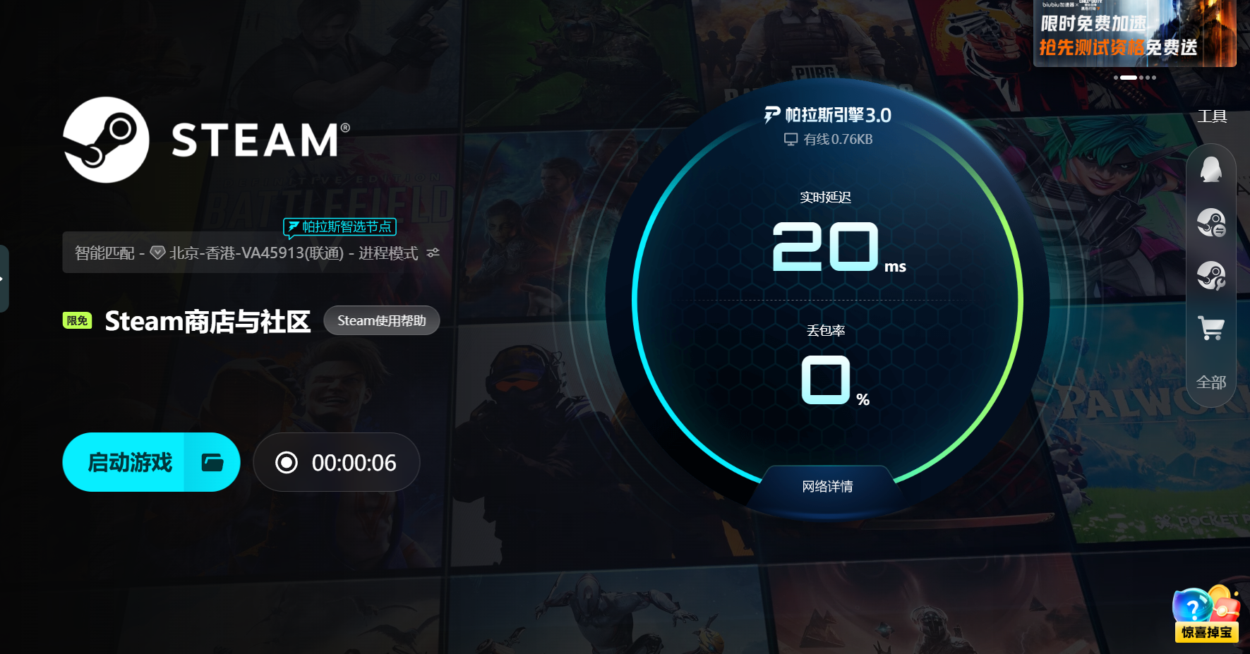 稳定连接的基础源自帕拉斯引擎3.0的智能动态调度技术,系统实时监测各线路质量,并将请求分配至最优通路;一旦检测到某节点延迟上升,毫秒级内自动切换至更通畅链路,大幅降低握手重传概率,平抑延迟波动,确保登录流程与资源加载走最短路径。biubiu体验官、职业选手左梓轩参与实测,开启加速后网络稳定性显著提升,延迟波动明显减少。