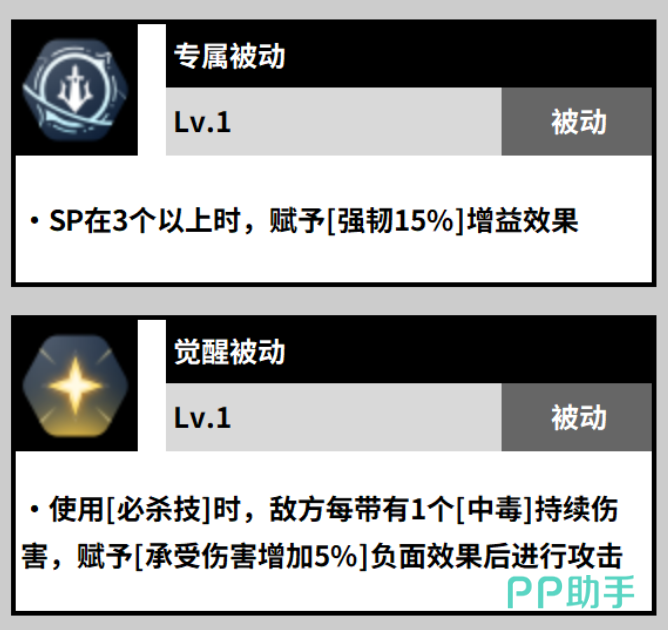 银翼大鹫拥有两项被动能力。其专属被动可在SP值达到或超过3点时,为自身提供15%的强韧加成;觉醒后,每次释放必杀技时,若目标身上存在中毒类DEBUFF,则每层可为其带来5%的伤害提升,并额外叠加一次中毒状态。此机制使得角色在面对已中毒敌人时输出显著增强,大幅提高爆发伤害能力。