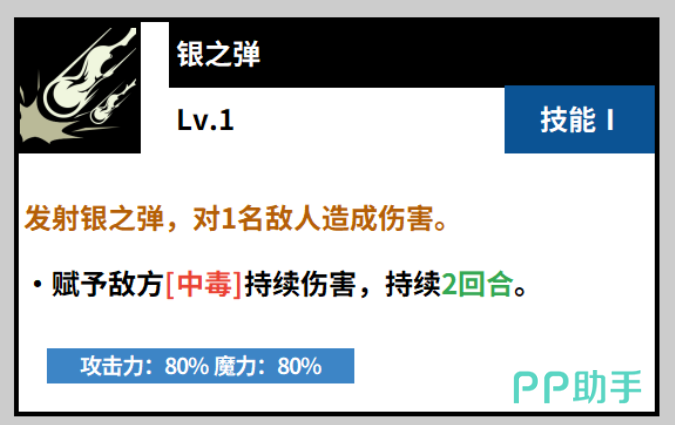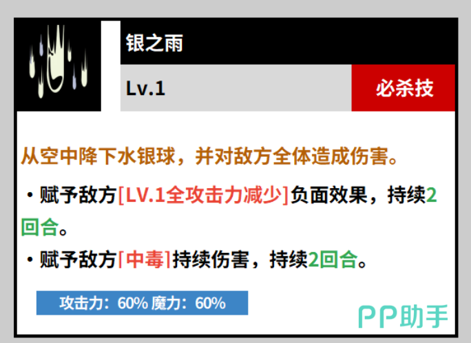 终极技能“银之雨”具备削弱敌方全体攻击力的效果,每次使用可降低对方一级攻击等级,同时再次强化中毒层数。尽管技能本身的数值伤害不算突出,但在中毒叠加至多层后,配合持续性掉血效果,整体输出表现极为可观。对于组建以持续伤害为核心的阵容而言,该角色是实现高效上毒的关键人选。
