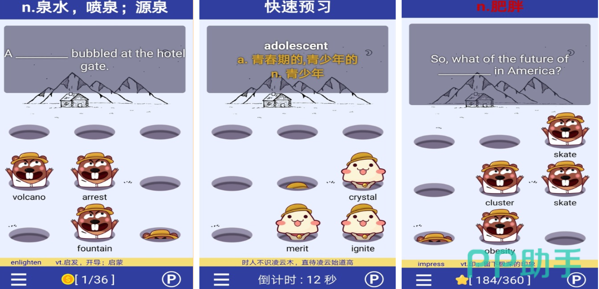 将经典打地鼠玩法与英语学习巧妙融合的作品。游戏中出现的地鼠携带不同单词,玩家需根据提示精准点击对应目标。节奏紧凑,反应要求高,同时强化单词识别能力。多层次难度设定满足进阶需求,是锻炼反应力与词汇储备的双重选择。