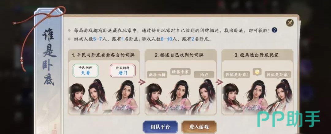 这是专为小群体设计的语言类互动游戏,非常适合三人聚会使用。每人抽取一个词语,其中两人拿到相同词汇,另一人获得略有差异的“卧底词”。每轮轮流描述自己的词,既要避免暴露又要找出卧底。随着描述逐渐离谱,误解频发,现场往往笑作一团。有人因紧张说错关键词被误判,也有人过于聪明反被怀疑,整个过程轻松又富有娱乐性。
