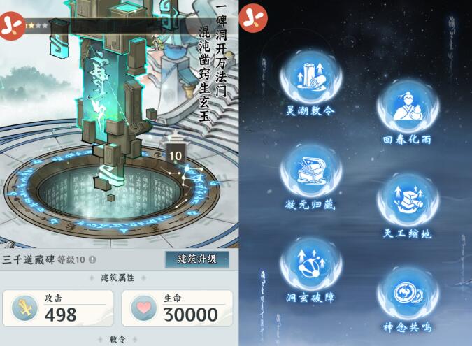 这是整个宗门当中最为核心的建筑,宗门里面的每一个建筑与三千道藏碑的等级都息息相关,因此这也是玩家要优先升级的游戏建筑。宗门当中所有的建筑等级都不允许超过三千道藏碑。不过该建筑的作用还是非常显著的,玩家们可以在游戏当中使用专属的技能提升宗门的产出,或者是依靠该建筑帮助下的弟子进行疗伤。三千道藏碑一共有六种效果,第一种是灵潮敕令,发动以后能让弟子在短暂的时间内干劲十足,并且提升宗门的产出效率100%,持续12分钟。