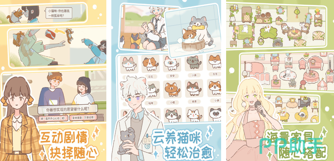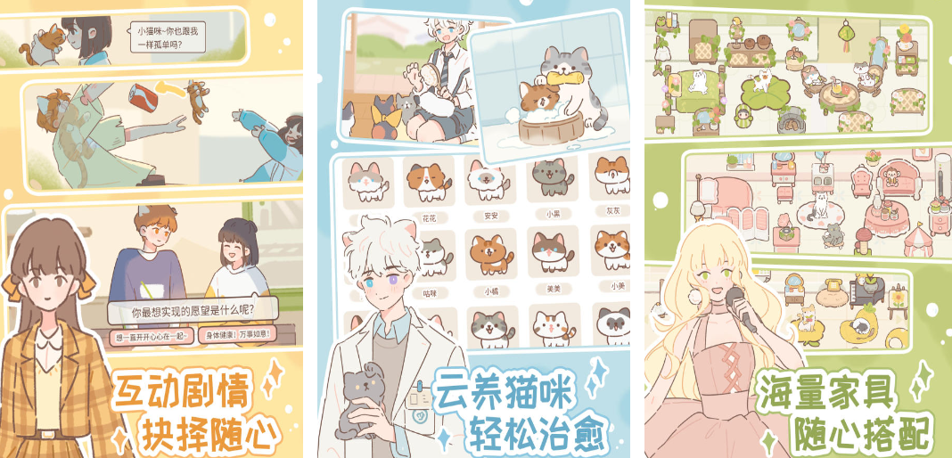 这款游戏也是那种画面非常温馨、清新的放置类休闲游戏。游戏内有着很丰富的剧情内容,而且非常有意思的是,它的剧情是通过互动漫画来进行呈现的,根据玩家们做出的反应和选择的不同,后续的漫画也会相应发生改变。游戏内元素很多,既有换装、还有房屋装饰、还有模拟照顾小猫,最好玩的是玩家在游戏内还可以去了解小猫的趣事,和不同性格的小猫互动聊天,如果有喜欢小猫的玩家可别错过了。