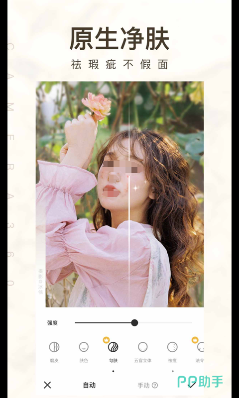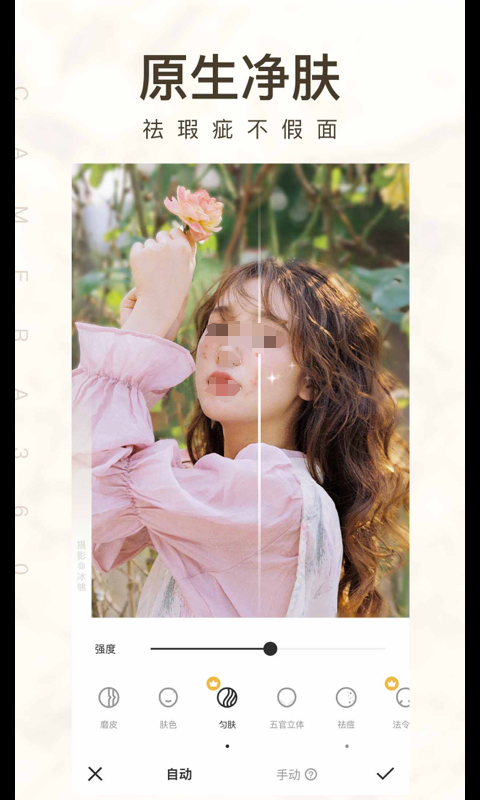 支持用户去改变定制APP,可以瘦脸、大眼等,并且美化的程度都能调试,以此能避免掉千篇一律的标准脸。最惊艳的是自然磨皮效果,能淡化痘印、黑眼圈却保留毛孔纹理,放大照片可见眉毛根根分明哦,还有智能补光功能超实用,黑黑的照片瞬间就拯救!