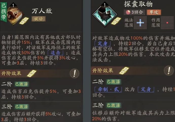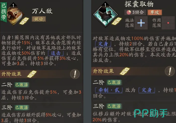 万人敌则是他的核心被动技能,使用这一技能,要在没有友军的情况下进行释放,在对地方目标进行释放,该技能之后可以对他们产生二次的追击伤害,对这一技能升级之后,可以给自身或者是队友提供免伤辅助,在回血时的效果也很显著,这两项技能在顺序上的选择,对于一场战斗来说也是很重要的。