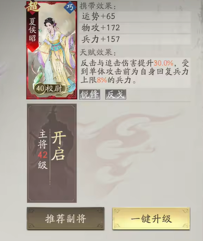 一名武将的成长必然离不开副将的帮扶,夏侯昭则是他的最佳副将人选,可以说这个角色是为张飞量身制作的。有了夏侯昭加入,可以使张飞的反击伤害快速提升,由于张飞本身就是一个勇猛的角色,夏侯昭为他提供的续航效果,可以使他的强大作战力持续很长时间,给敌人造成诸多负面性的伤害。攻打敌人的硬度提升就必然会亏损很多的输出能力,此时可以选择朱灵或者是鲍信这样的红色副将,他们都是能够提升张飞作战硬度的,在打击敌人之后可以使敌方处于一个无力回血的状态,短时间内就可以暴毙身亡。