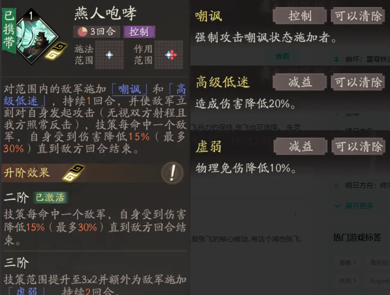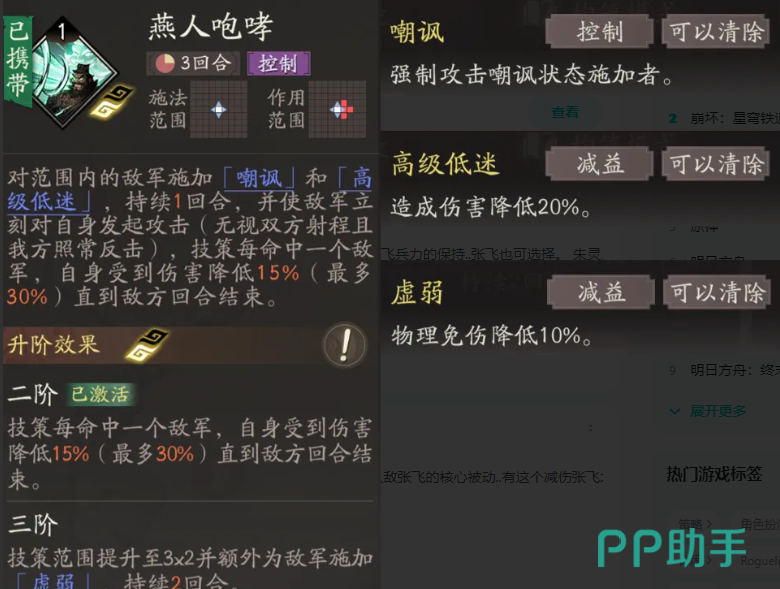 燕人咆哮是张飞的一个强控制技能,可以同时嘲讽多个敌人目标,嘲讽同时附加的高级低迷效果可以使敌人处于一个非常不利的作战状态。即使敌人向我方发起进攻,也能够将伤害降至到最低。这一技能的有效升级可以将攻击的范围扩大,并且还能给额外的目标敌人造成物理免伤降低,如果刚拿到张飞这个角色,那么小编建议可以优先提升,这一控制技能的等级提升。