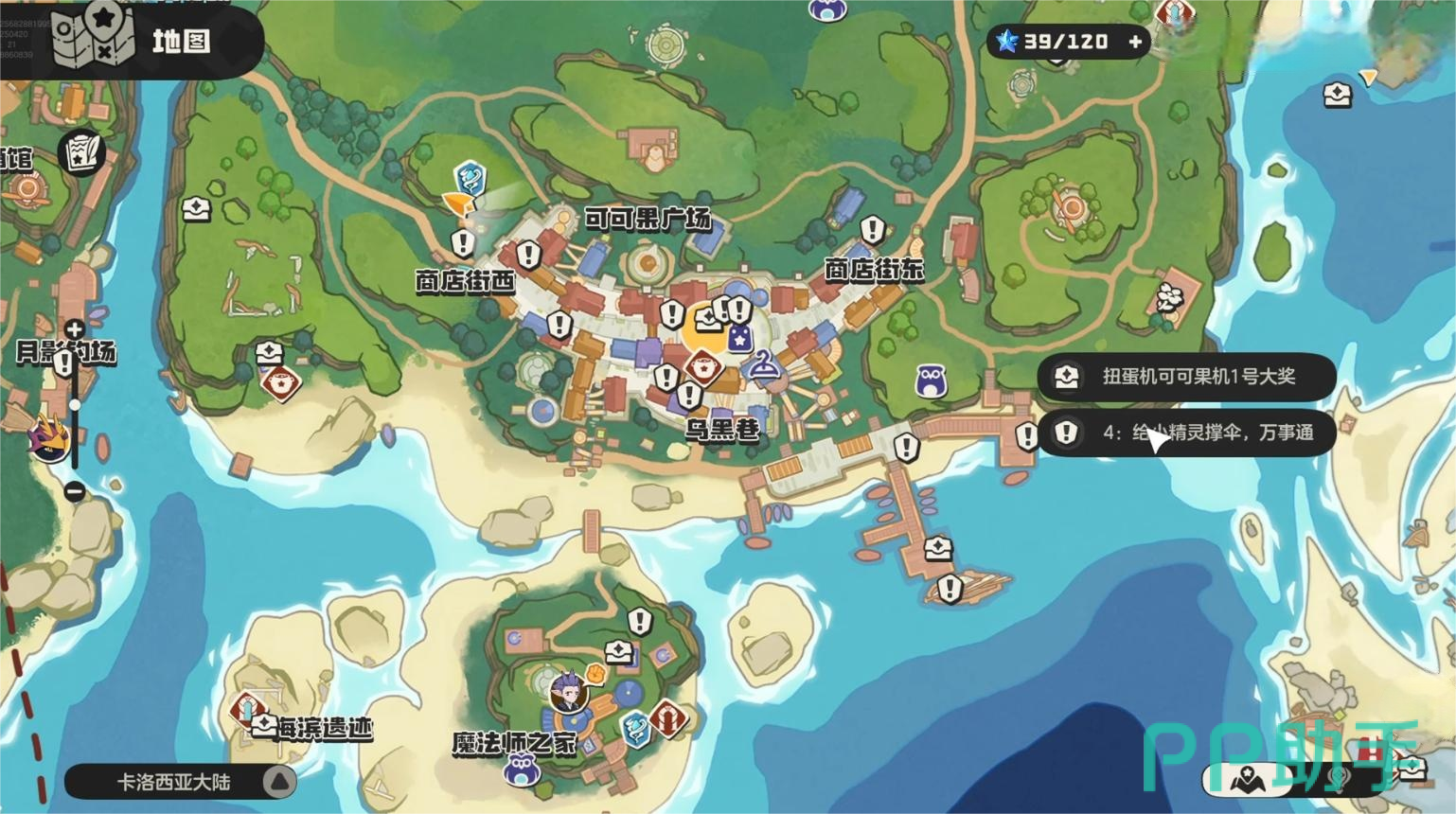 在可可果广场周边也有多个互动小游戏可供挑战。例如“为小精灵撑伞”任务,只需与NPC对话并按要求操作即可完成,成功后能领取成就奖励。此外还有场景互动玩法,需要携带特定精灵参与,比如通过敲击鼓类机关完成挑战,最终打开宝箱获取道具奖励。