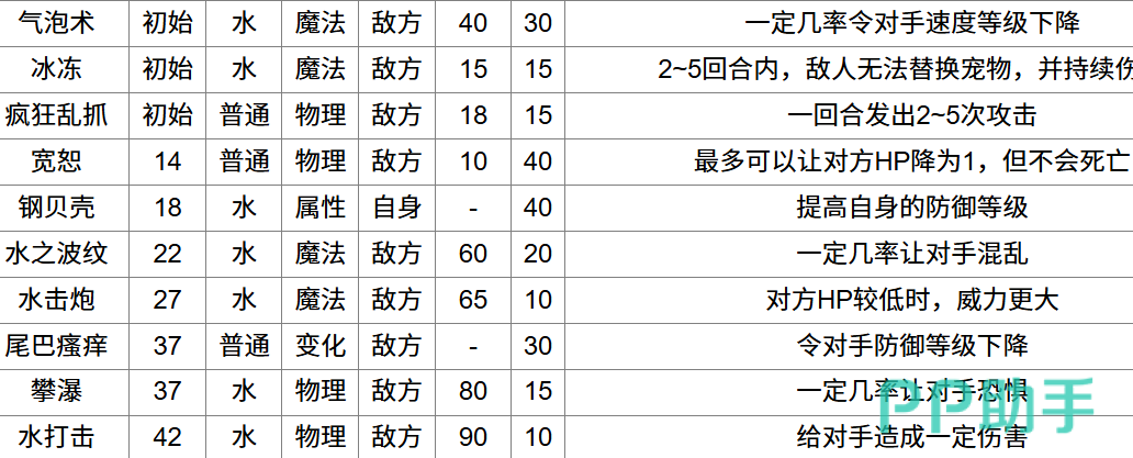 在技能配置方面,可选范围包括气泡术、冰冻、宽恕、钢贝壳、水之波纹、水击炮、尾巴瘙痒、攀瀑和水打击等。若对技能组合感到迷茫,建议尝试“宽恕+尾巴瘙痒+攀瀑+水打击”或“水打击+尾巴瘙痒+攀瀑+水击炮”这两套主流搭配方案。