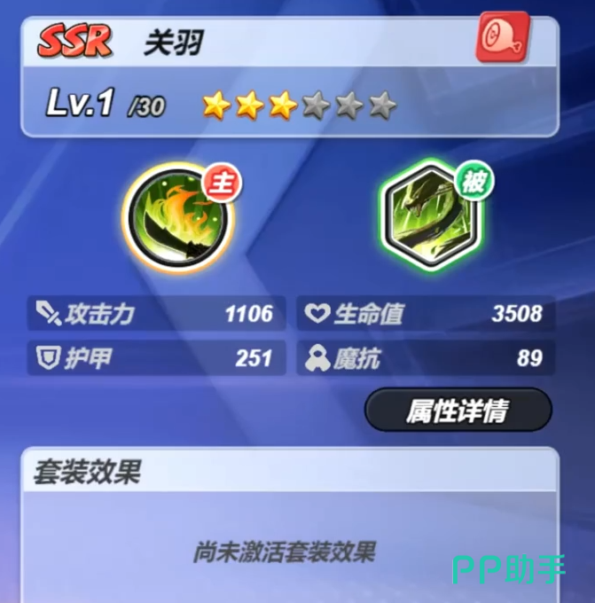 关羽在游戏中定位为SSR级别的角色,属于稀有度较高的单位。通常情况下,稀有等级越高的角色,基础属性与技能强度也更为出色。该角色以经典武圣形象登场,手持标志性的青龙偃月刀,整体设计兼具气势与实用性。从实战表现来看,关羽的各项能力数值均衡且突出,无论是新手还是资深玩家都能轻松驾驭,具备极强的泛用性。