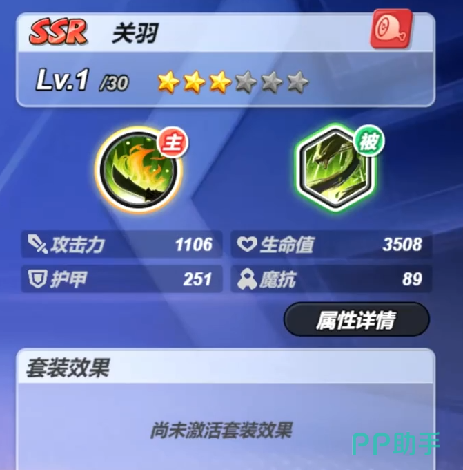 关羽在游戏中定位为SSR级别的角色,属于稀有度较高的存在。通常来说,稀有等级越高的角色基础属性和技能强度也更为出色。该角色以经典的武圣形象登场,手持标志性的青龙偃月刀,整体表现非常全面,无论是在输出、控制还是持续作战方面都有亮眼发挥,适合各类玩家使用。