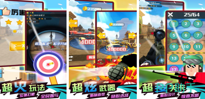 在指尖神射手这款游戏中,核心机制围绕子弹的反射轨迹展开。通过手指滑动屏幕调节发射角度,利用关卡中的各类墙面实现多次反弹打击敌人。场景构造丰富多样,从单层木板到复杂网格结构,均需精细计算弹道路径。随着进度推进,可解锁具备爆炸效果的特殊武器,一次命中即可波及多个目标,增强清敌效率。