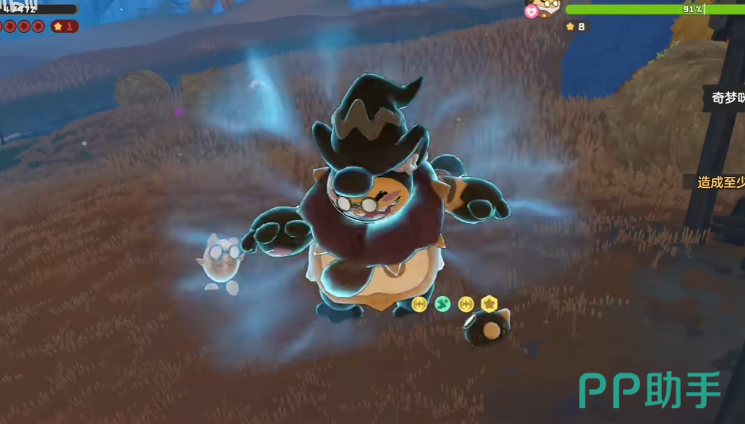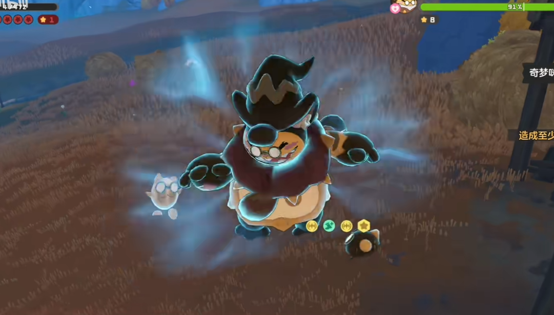 了解技能后,接下来便是如何应对的实战策略。奇梦咪开局具备5层护盾,并处于空中状态,此阶段会通过召唤小怪进行干扰。此时推荐使用【星星魔法】直接打击本体或清除召唤物,以快速削减护盾值。当护盾被打破后,奇梦咪将被迫落地,进入第二阶段对战。