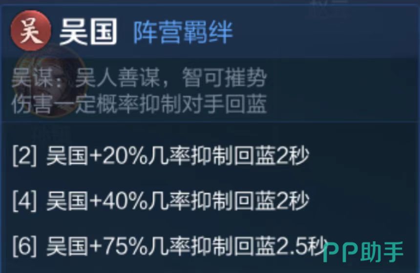 游戏当中吴国的羁绊通常不是最为强势的,但却是游戏中针对性最强的羁绊。凑齐6位吴国阵营的角色,那么吴国角色在对敌人造成伤害的时候,就有75%的概率抑制敌人的蓝量回复持续2.5秒钟。该羁绊虽然在游戏起初效果并不明显,咋一看并不如蜀国和魏国的羁绊效果,但是随着战斗时间的持续增加,当敌人的蓝量消耗一空时,或者应对法师多的阵容,吴国的羁绊却是非常强大的存在。