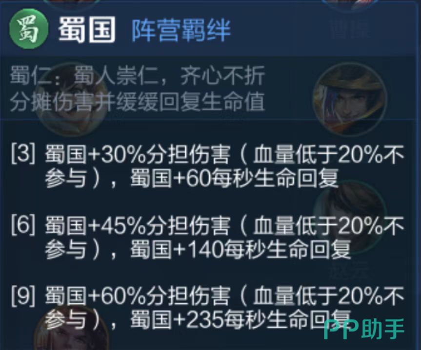 羁绊和阵营比较类似,但是和阵营却全然不同。目前游戏当中一共有四种羁绊,分别是魏蜀吴和长安。游戏当中的羁绊共有三个等级,羁绊等级越高,获得的加成也就越强,提升羁绊等级的唯一方式,就是让相同阵营的英雄上阵。蜀国的阵营羁绊将会给全体蜀国角色,带来高额的生命回复效果和伤害分摊能力。当蜀国9位角色全部上阵,那么蜀国的角色每秒就会恢复235点体力值,并且将自身受到伤害的60%十分摊给其他全部的蜀国队友。