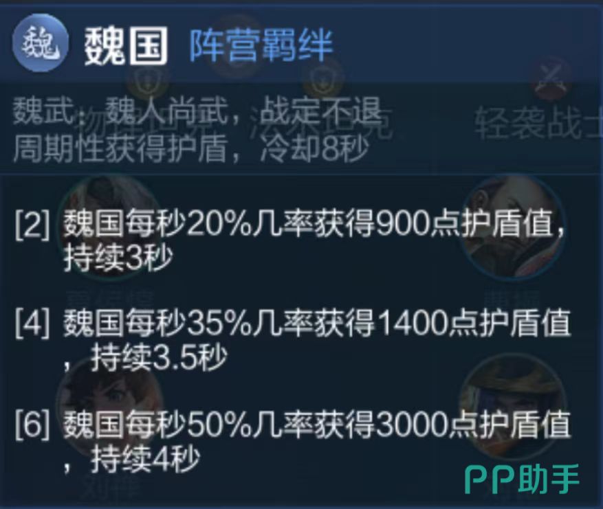 魏国的阵营羁绊也是游戏当中非常强势的,凑齐两名魏国角色,魏国的羁绊就会生效。每秒钟都有20%的概率获取900点护盾,护盾确实还不错,但是概率却却并没有很高,一场战斗下来触发的次数还是非常有限的。但是当玩家们上阵六名魏国角色的时候,魏国所有角色每秒钟就有50%的概率获取3000点护盾了,并且这个护盾还可以持续4秒钟,可以说是非常的强势了。