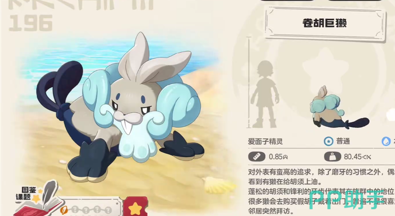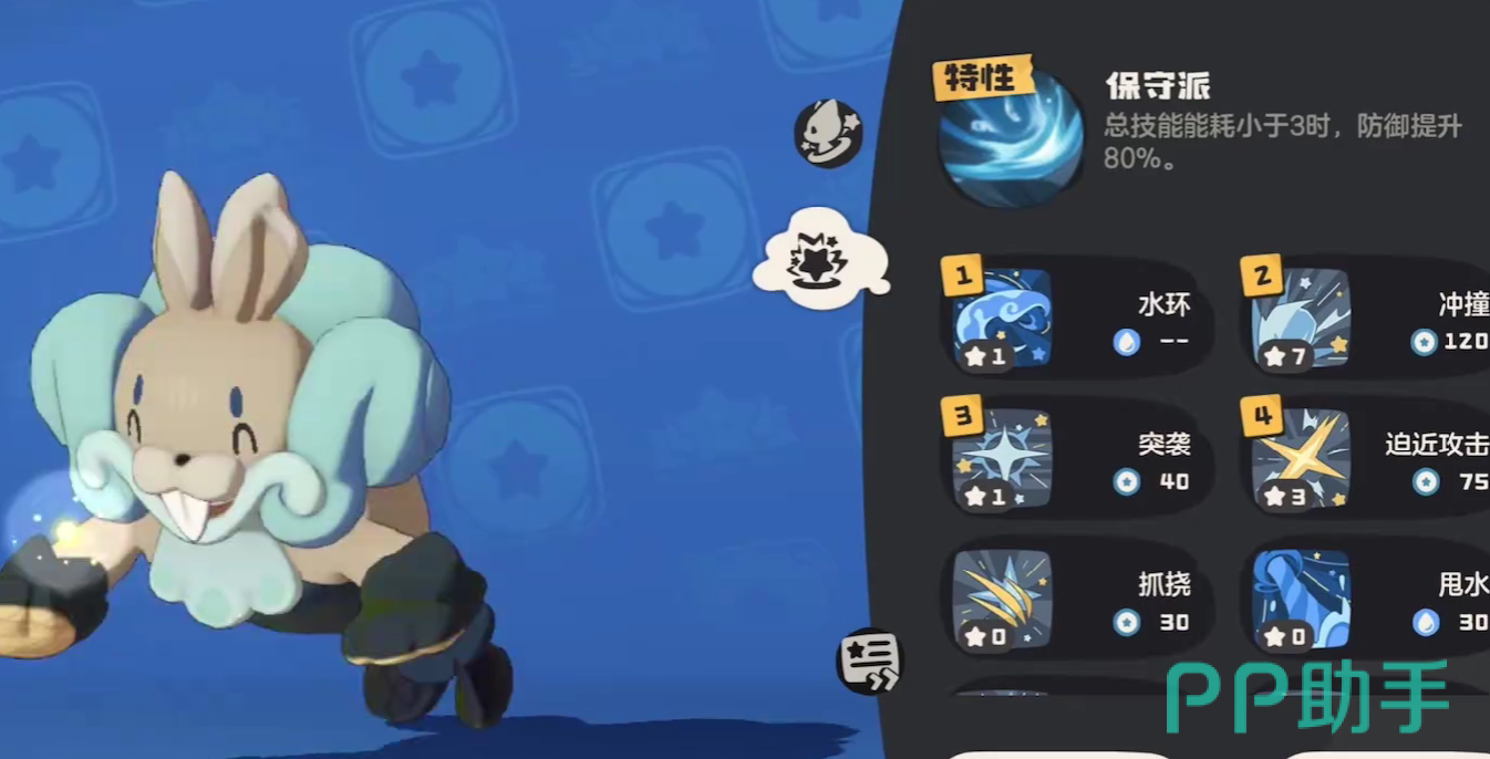 卷胡巨獭主要技能为,水环、冲撞、突袭、迫近攻击、抓挠、甩水,同时在甩水攻击命中时,可以为敌人施加一层潮湿印记效果,在战斗当中,保守派的特性,可以保证他在总技能消耗小于三时,防御力提升80%。