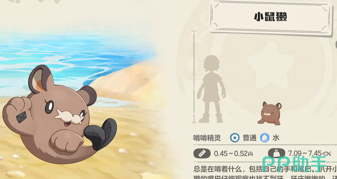 小鼠獭在游戏当中的属性为“普通”以及“水”属性,特征是拥有保守派的技能数值,当等级达到30级时,进化成为“高尾獭”,等级达到48级时,进化成为“卷胡巨獭”,在游戏内,玩家可以直接选择前往到治愈兔附近的“海滩”中,即可直接捕猎小鼠獭。