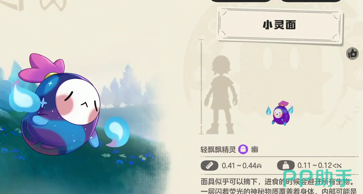 小灵面在游戏当中是一个幽灵属性的精灵宠物,定位是“轻飘飘精灵”,由于性格设定较为社恐,玩家在大世界内和小灵面互动时,小灵面时常会露出一些较为可爱的表情。