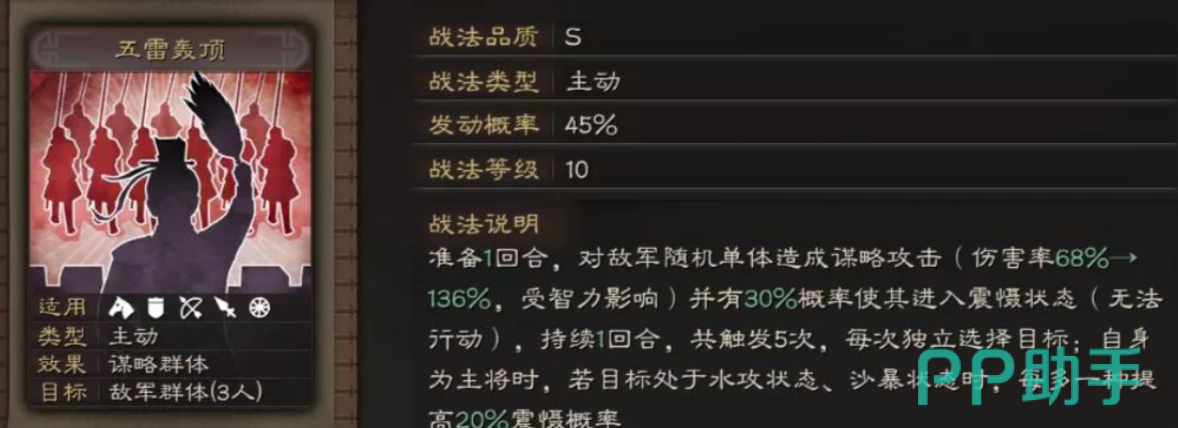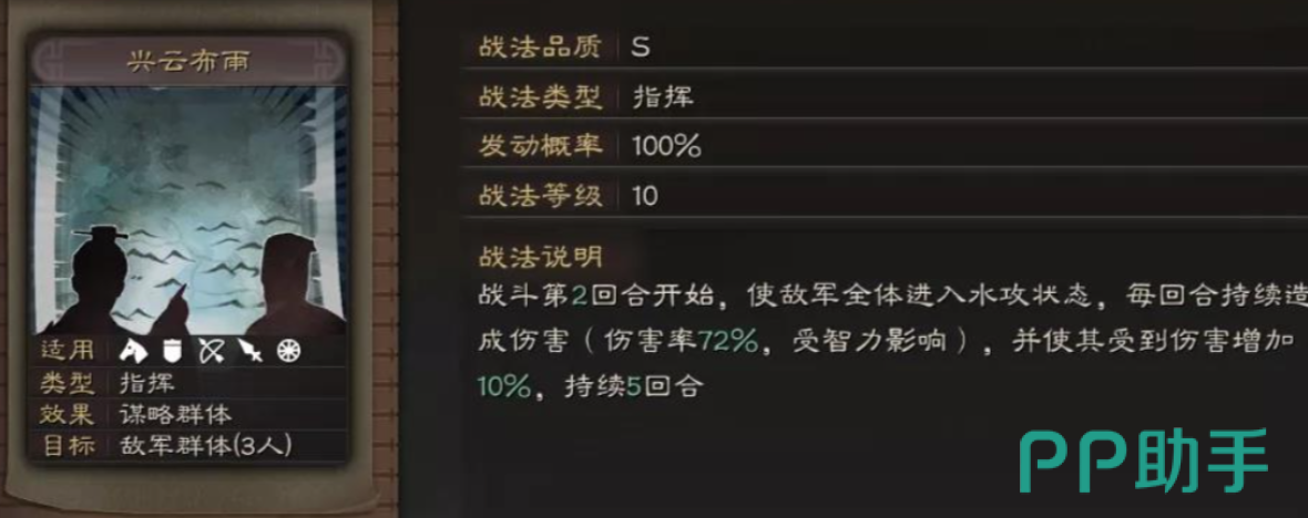 于吉的核心战法兴云布雨是于吉在游戏中立足的重要技能。此战法可使敌方全队都陷入“水攻”状态,造成一定的法术伤害。该技能除了群体输出稳定之外,更主要的是自带的控制效果,给队友创造了一个非常好的输出环境。尤其是在于吉、张角两人同时上场时,可以组成控场与连携爆发的强力组合,张角用雷系战法造成持续伤害,于吉则给予敌人稳定的水攻状态,使敌人更容易陷入震慑与连锁反应之中。