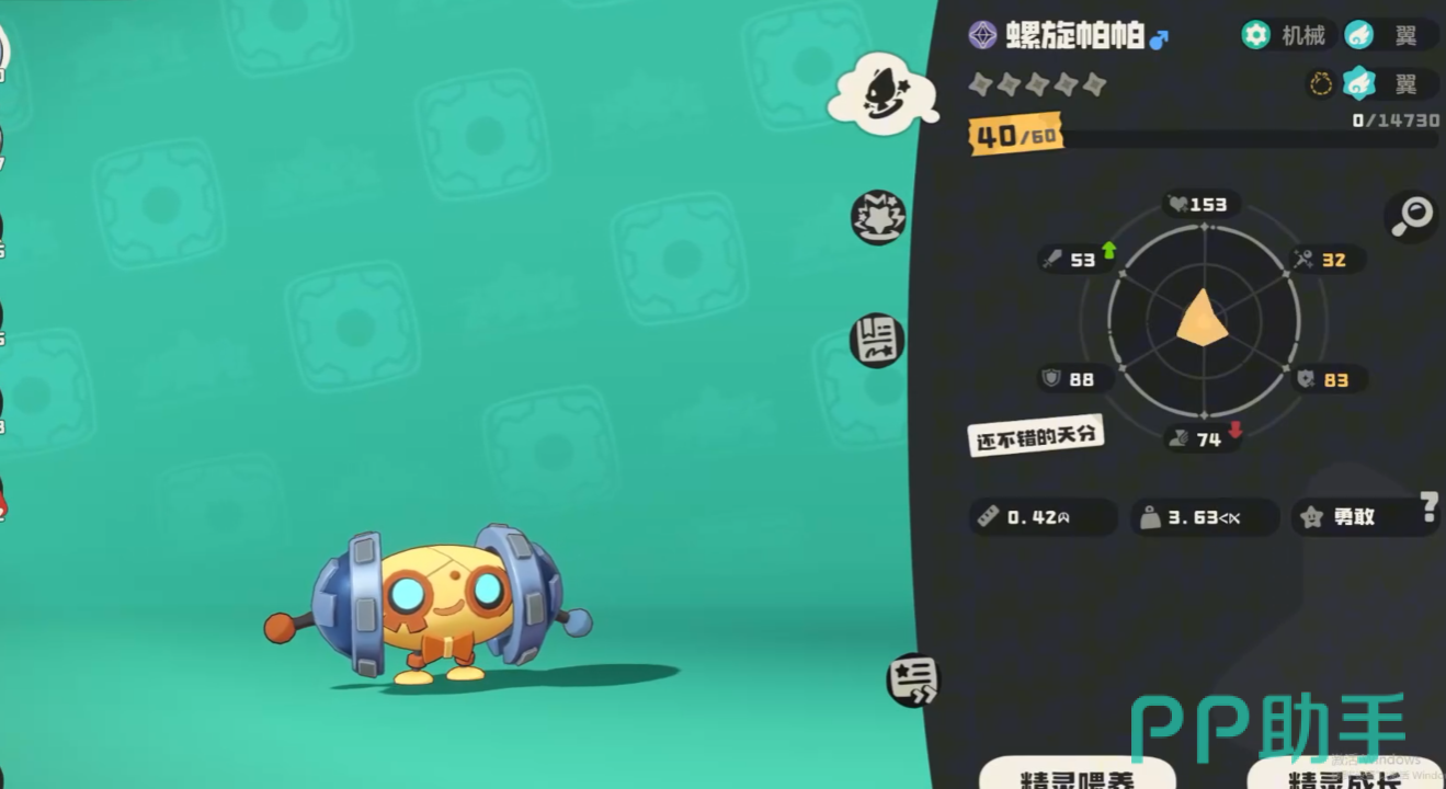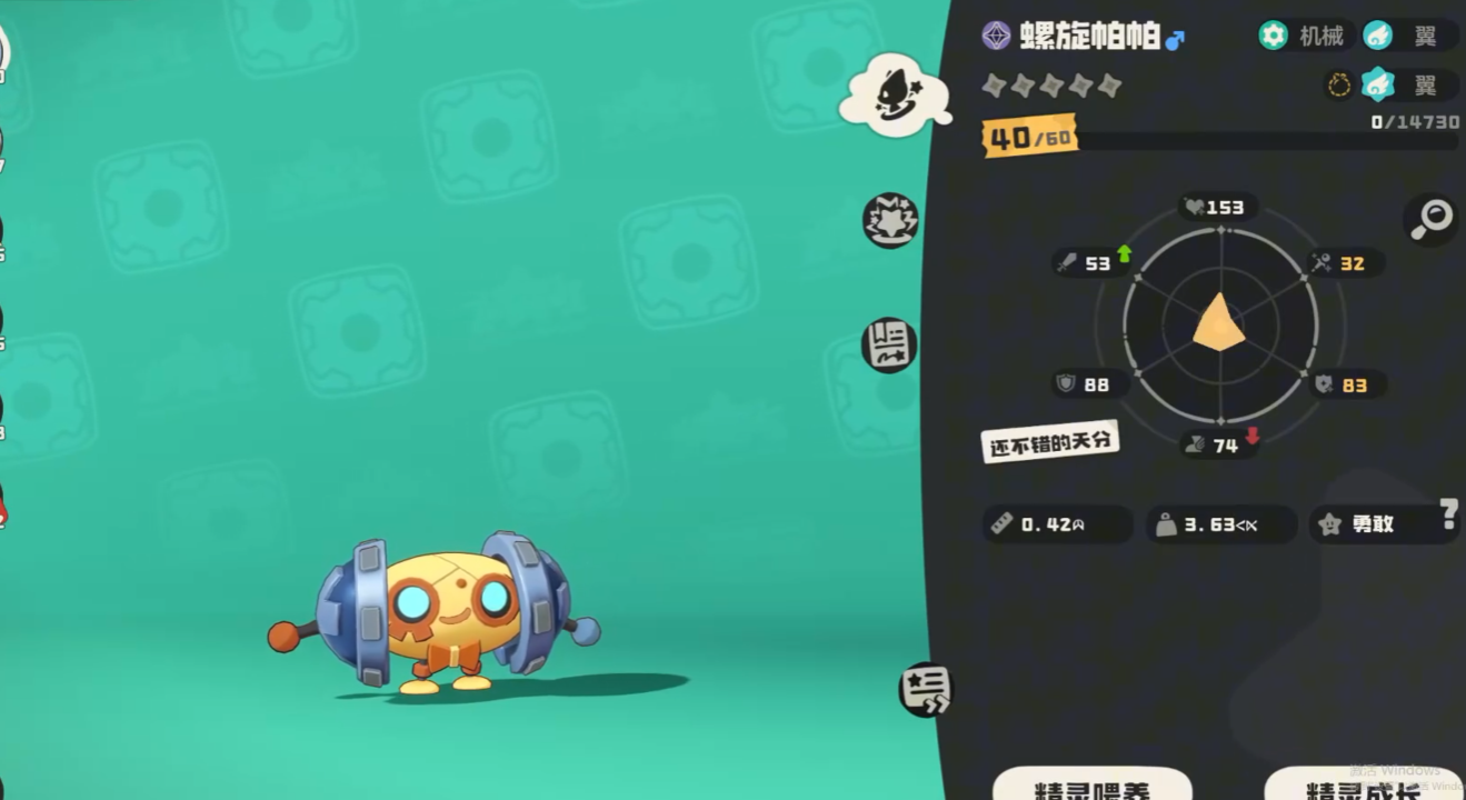 “螺旋帕帕”于游戏内的属性是机械属性和翼属性,它的种族数值为378点,生命数值为79点,物理攻击数值为42点,魔法攻击数值为17点,物理防御是87点,魔法防御是73点,基础速度数值80点。