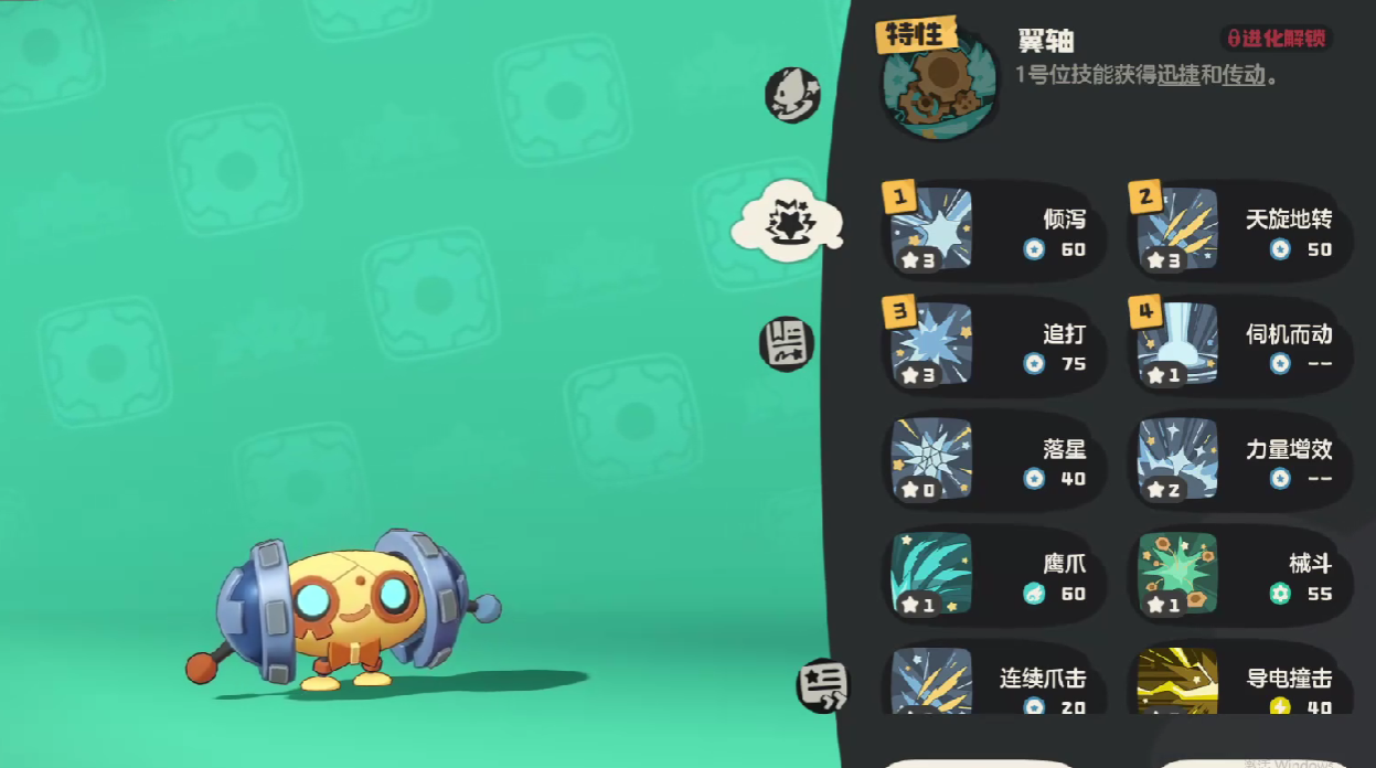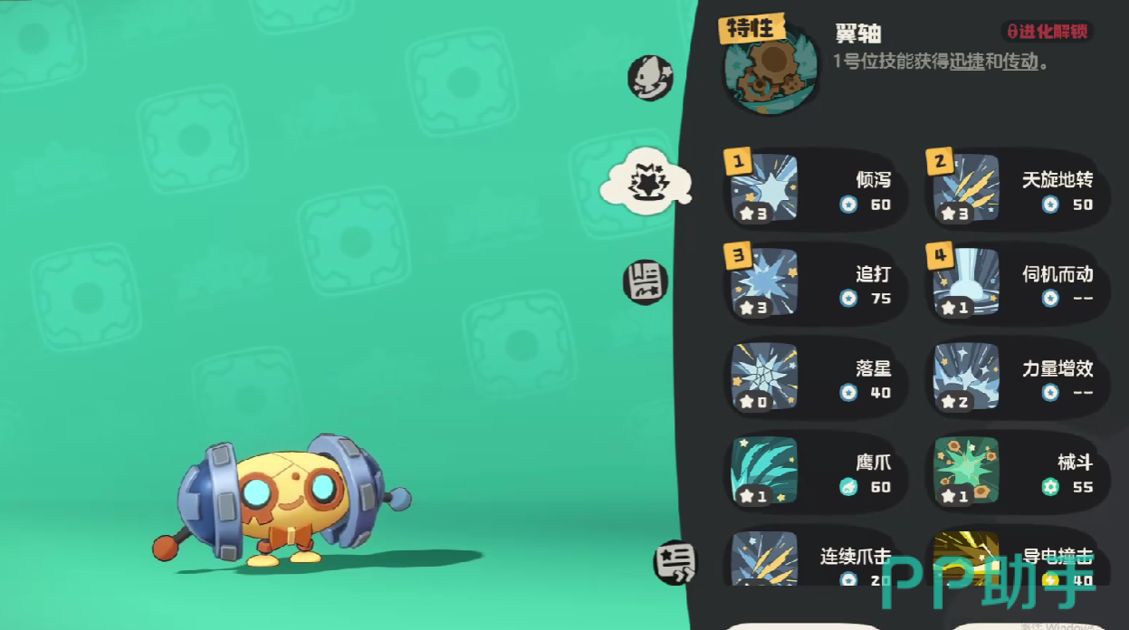 螺旋帕帕在进阶之后,还能够获取特性“翼轴”,使得战斗之中一号位的技能,直接获取“迅捷”和“传动”效果,核心技能可以携带倾泻、天旋地转、追打、伺机而动、落星、力量增效、鹰爪、械斗、连续爪击、导电撞击。