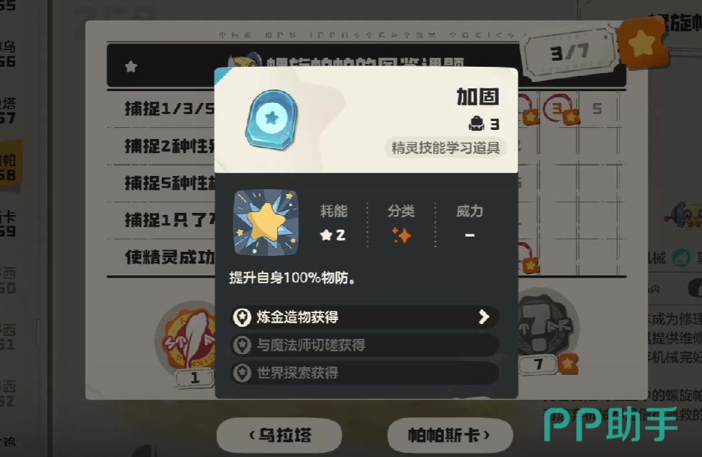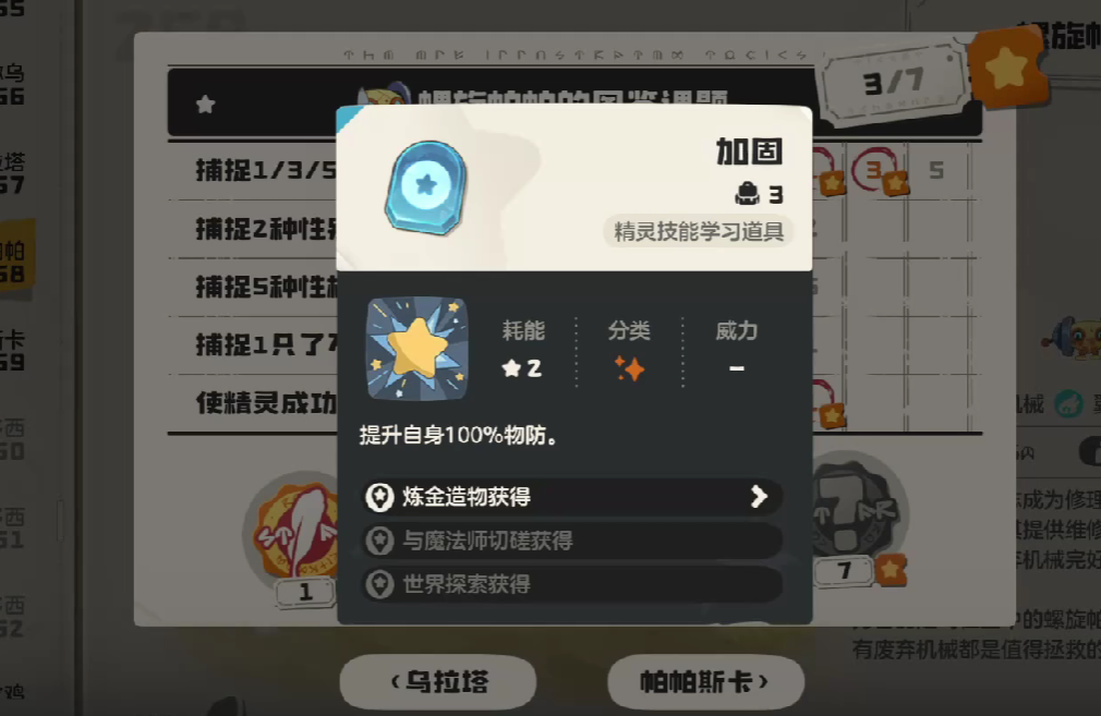 为了加强螺旋帕帕的技能强度,玩家也可以给它学习“加固”技能,直接增加精灵的物理防御100%,强化螺旋帕帕坦度和前排抗伤能力,保证能够持续性的在战场上存活。