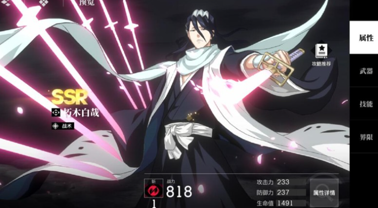 朽木白哉是一个全能型的角色,兼顾输出以及辅助。大招的设计比较有特色,可以将刀刃直接幻化成浮空的状态,自动追踪锁定敌人,并且造成持续性的伤害。同时还可以生成防御屏障去有效保护队友,这种攻守兼备的技能组合就可以在速通副本时就直接提升效率。