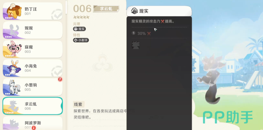 游戏中求云虬除了自身的战斗能力之外,还有一个冒险能力,所以用到这个精灵的情况也比较多,如果初始情况下都要用到它,不光是战斗里面可以上,还可以在冒险地图里面探索的时候上这个角色,它也可以带来一定的加成,那么使用求云虬的时候,大家要注意它因为获取难度比较高,所以这里能力上面也比较高,他在游戏当中属于现实元理当中的一个精灵,现实原理的精灵其实目前是只有他一个的。
