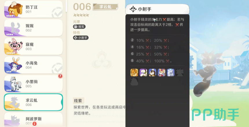 小射手类特性目前的话,大家可以选用的情况还是比较多的,目前对于小射手这类精灵的效果来说,主要的也是放在攻击力提升效果上面,所以求云虬这个精灵的话,根据它的原理和特性带来的整体攻击百分比提升都是比较高的数值,后期如果跟攻击目标之间距离是比较大的情况下,它的攻击能力会比基础的百分比得到更多的提升能力,比如说如果是在两个小射手一起上场的话,他们自身的能力本来是基础的10%攻击提升,如果此时跟敌人的格子相差大于两格的话,那么此时带来的百分比则是20%,最多的情况下是有了8个小射手一起上阵,那么此时是40%的攻击提升,如果格子大于两格的话,那么带来的百分比最高是可以达到百分百的。