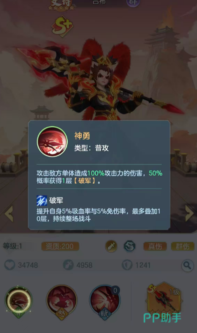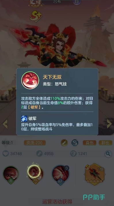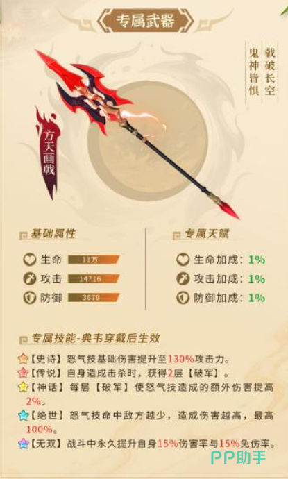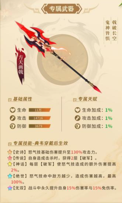 虽然基础的属性提升比较低,但是后期根据他这个武器的专属技能也可以带来足够的穿戴效果,在后期他达到了史诗级别之后,这个武器会为怒气机制带来足够的基础伤害提升效果,这里达到的百分比也130%,达到这样攻击力的情况下,他的这个专武还是比较推荐大家去装备的,那么如果是在吕布达到了传说级别的情况下,在他自身利用这个武器造成攻击的时候,如果成功成功击杀敌人的话,那么此时他身上则会获得两层破军状态的加成,这个破军其实是在他游戏当中专属的一个状态,是可以提升他自身5%的吸血效果,以及5%的免伤率,而且根据他这里的叠加层数,最大上限是4层的情况下。