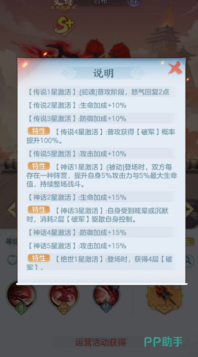 此时带来的能力就是在一星的时候可以激活一个蛇魂的能力,蛇魂带来的效果是体现在普攻阶段,只要达到普攻阶段的神魂出发,那么此时吕布他的怒气就会自动恢复两点,所以后期,他在自身的怒气技能使用概率上面会更大一些,而达到两星的情况下,他生命加成会有10%的提升,达到3星的情况下,则是防御加成上面的10%提升,所以他相对前面的技能来说,天赋技能效果上面基本都是一些属性上面的提升。