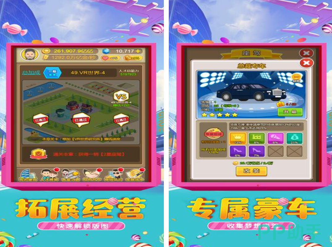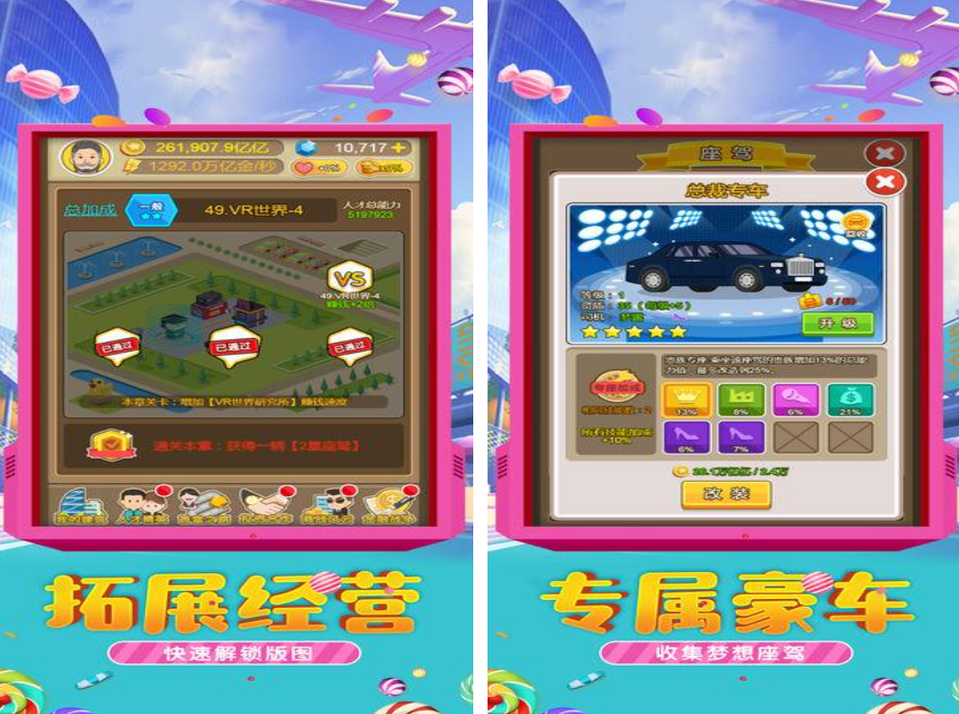 这是一款休闲经营类的放置游戏,玩家们在游戏中将从一个身无分文的穷小子开始,一步步建设属于自己的商业王国。游戏内也是需要玩家去放置各类经营设施,在放置的时候需要注意摆放的位置和设施之间的互相辅助,同时还可以招募各种人才去帮忙管理从而提升收益,还能够让招募的人才去进行升级培训。游戏内还有着闯关模式,里面有着各种不同的世界,每个世界的特色建筑物也不同,玩家们可以去自由探索!