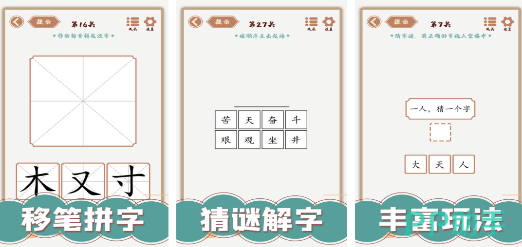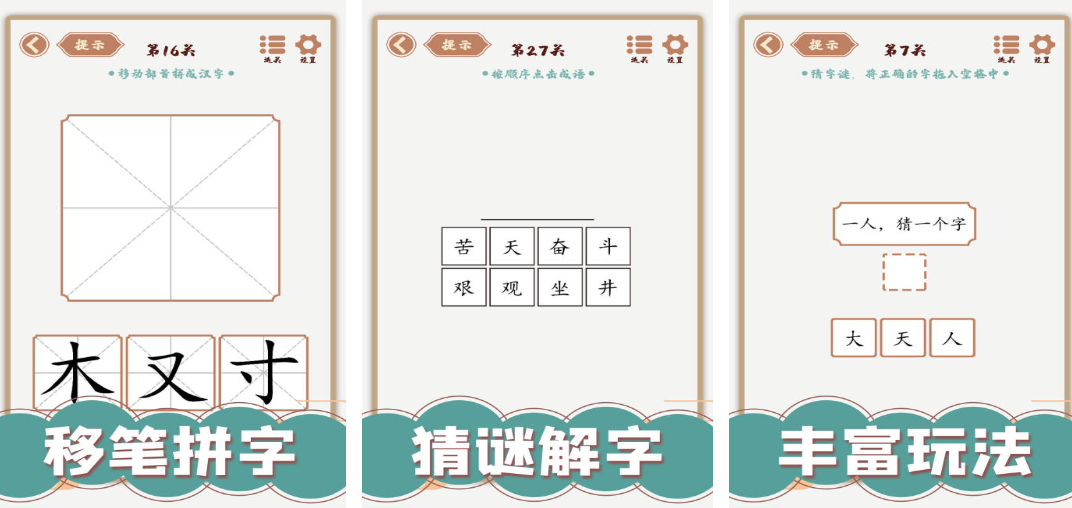 这款游戏相较于上面四款游戏来说,难度会高不少,所以比较适合给已经有一定汉字基础的孩子去尝试。这款游戏就是纯粹的汉字闯关玩法,每一关的要求都不一样,从更加多样的角度去锻炼孩子的识字能力,模式多样,有给汉字换偏旁的、也有找出正确成语的、还有找到正确汉字并给它加减笔画的,在游戏的基础上为孩子巩固学到的汉字知识。