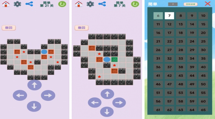 本作也是款轻量级单机版小型休闲类APP,主打推箱子的游戏机制也能获得放松解压的好心情,上千个推箱子解谜闯关关卡呈现出的休闲性都不错,四个操作按键可使用能快速且轻松的推箱子互动,关卡中地图设定都与众不同可利用地形推箱子,只要成功将每一个箱子都推到星星标注的地点就可以通关。