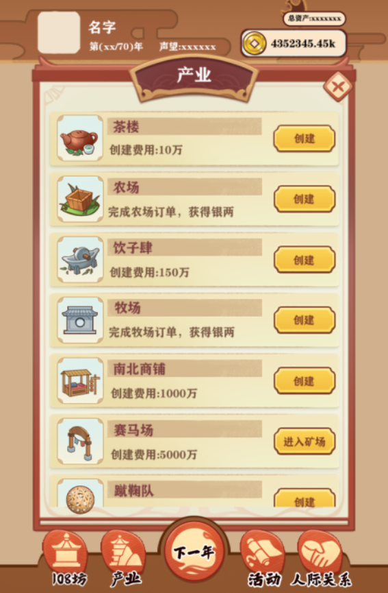 这个游戏可以理解为“重生之我在唐朝当老板”,是一个以唐朝为背景的人生模拟经营游戏,玩家在游戏中有很多种经营方式可以选择,比如开茶楼、开农场、开赛马场等等,都结合了唐朝时期的风土人情,当然想要开店当老板,最重要的就是银子和票子,只有用心经营,多提高服务质量吸引顾客,才能赚得盆满钵满。