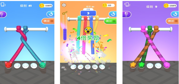 这款以绳索为核心玩法的益智闯关游戏提供了极为出色的互动体验,玩家将扮演一位专业“解绳师”,面对由三到四条交织在一起的绳索进行精准操作。三维立体的画面呈现搭配直观的触控方式,使得每一次拉动与分离都显得自然流畅。没有时间限制,也没有复杂规则,纯粹依靠观察力与逻辑思维完成挑战,是缓解焦虑的理想选择。