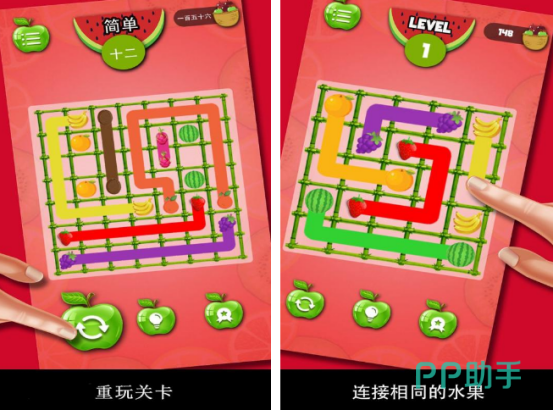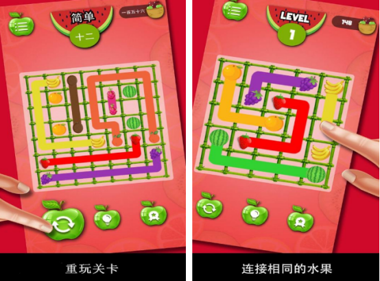 该游戏采用连线匹配机制,玩家需用线条连接成对的相同水果,完成关卡目标。每个关卡必须将所有水果成功配对才能通关,且连接线不允许交叉或重叠,随着关卡推进,布局复杂度逐渐上升,极具策略挑战性。适合喜欢动脑解谜的玩家尝试。