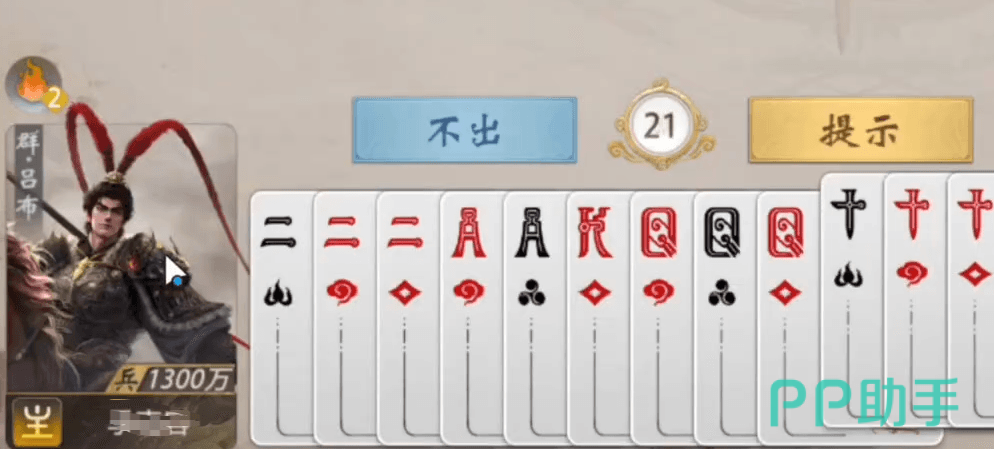 吕布的“无双”技能触发条件较为特殊:当自身连续6次未出牌或被压制出牌次数达到六次时,可一次性收取场上所有J、Q、K牌,这一机制使其在逆境中具备极强的翻盘潜力。