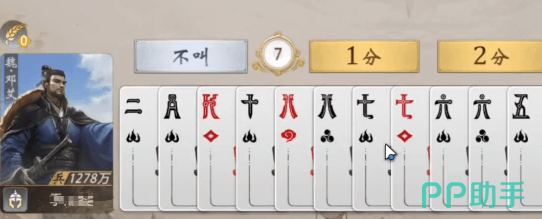 邓艾的“屯田”属于被动积累类技能:每当其他玩家出牌数量小于等于4张时,若邓艾选择不压制,则积攒1点粮食。当粮草值达2点可获得小王,3点兑换大王,4点则换取一张万能牌,极具战略价值。