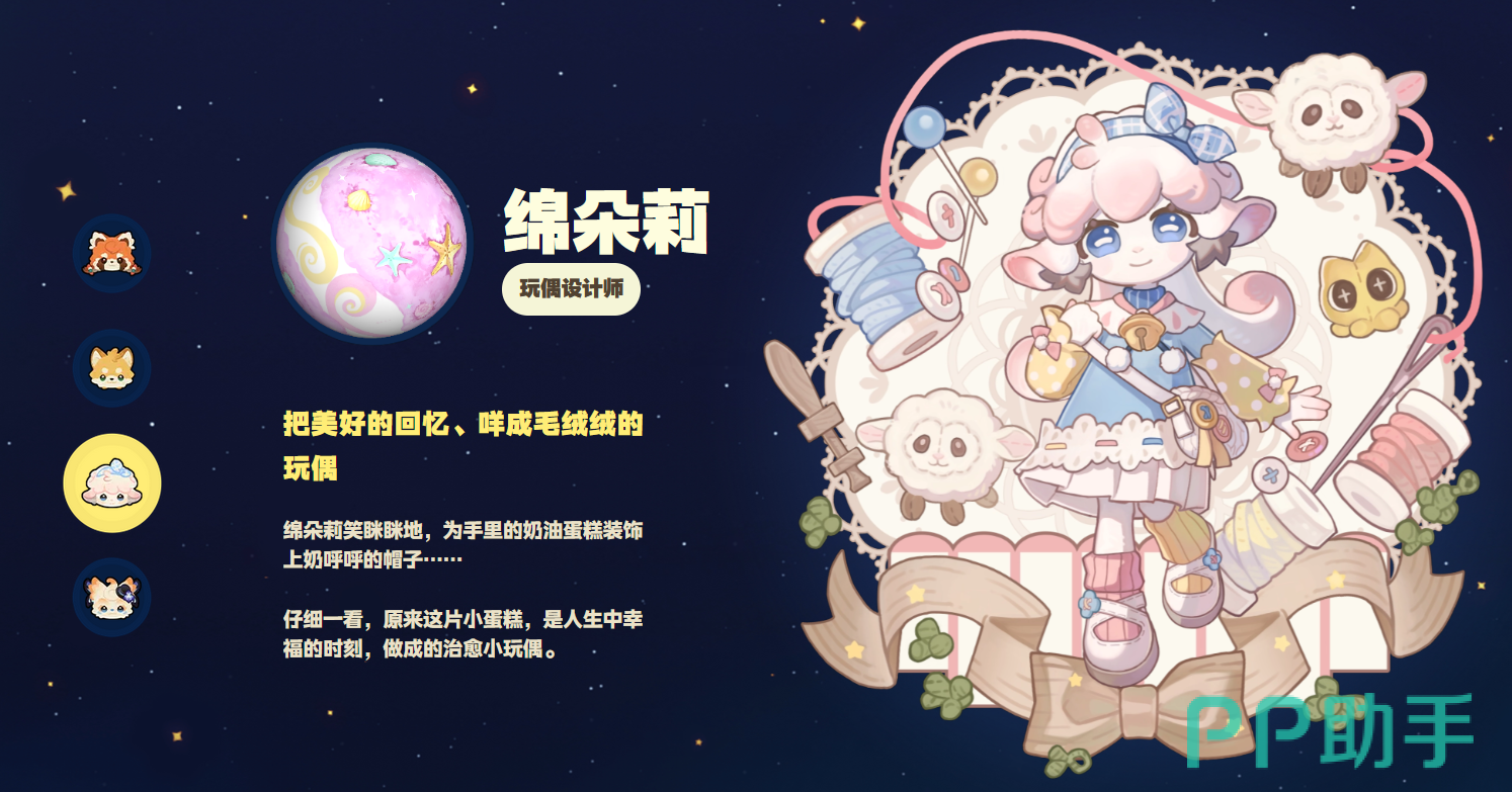 第三位角色是棉朵莉,一位温柔细致的玩偶设计师,形象源自粉色小羊,整体风格甜美柔和。她擅长将日常点滴的记忆编织成温暖的毛绒玩具,赋予每一件作品独特的情感价值,是星球上的治愈系代表。