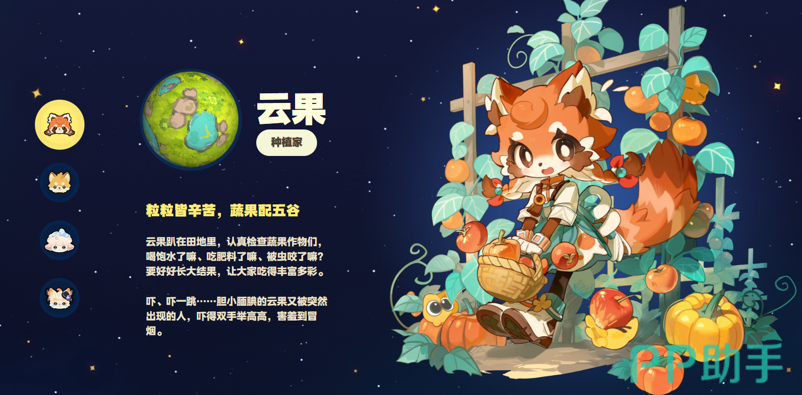 目前官方已释出四位主要角色的信息,分别是云果、伊佐奇、棉朵莉以及幻雪。这四位角色均采用动物拟人化设计,造型萌趣且各具职业特色。首先是云果,她是一位专注于种植的女性角色,原型为橙色狐狸,形象灵动讨喜。性格偏向安静腼腆,常常埋首于田间照料果树,是星球上不可或缺的农业担当。
