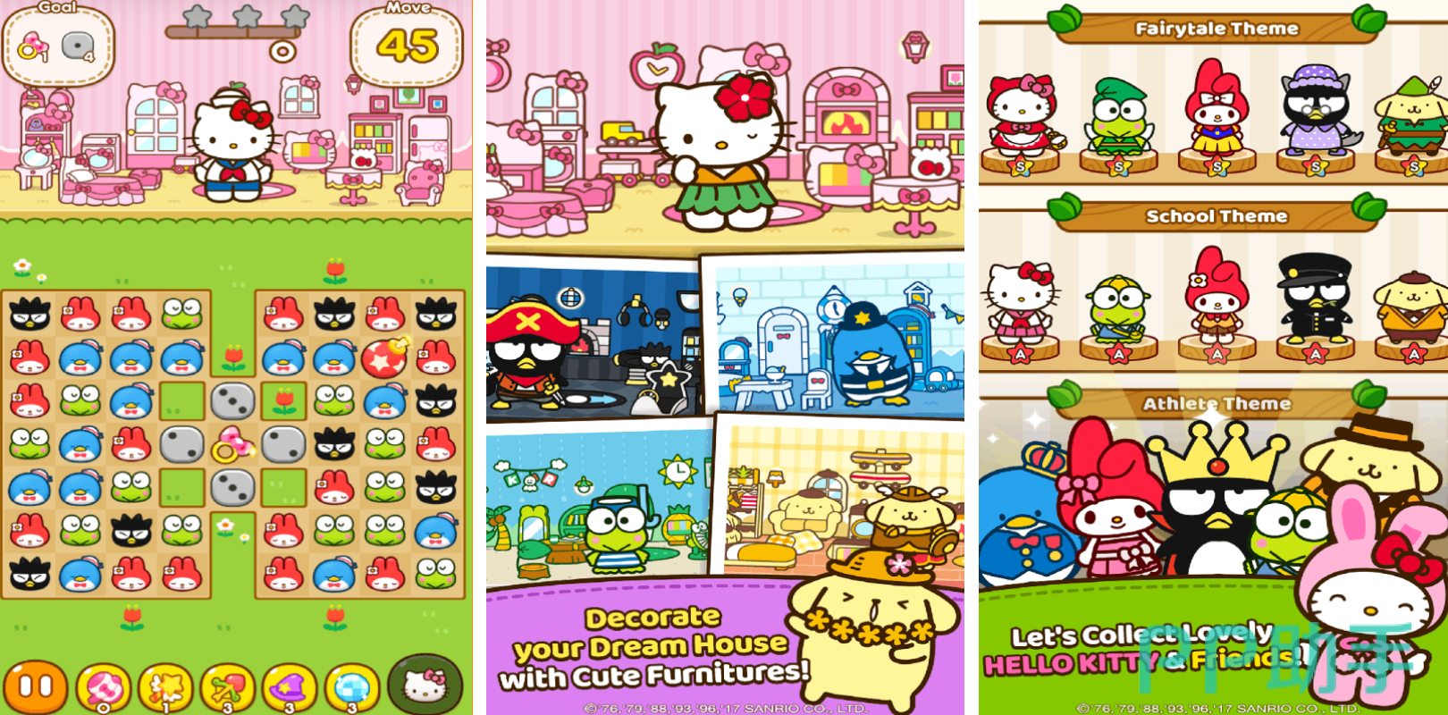 这是一款集合多位经典三丽鸥角色的消除类休闲游戏,以Hello Kitty为核心人物展开剧情。玩法采用经典的三消机制,每关都有特定目标需要达成方可通关。卡通渲染的画面风格清新柔和,极具亲和力。通过挑战关卡可获取金币,用于兑换不同服装主题的角色玩偶,还能为喜爱的角色购置家具,个性化布置专属房间空间,带来轻松解压的游戏体验。