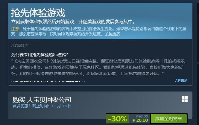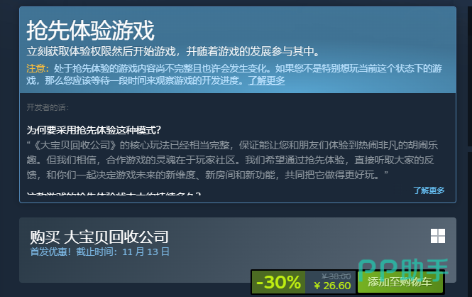 综上所述,大宝贝回收公司的当前售价为26.6元,限时优惠即将截止。虽然游戏尚未公布确切的正式上线日期,但已支持Steam平台的抢先体验功能,购买后即可提前进入游戏世界探索玩法。类似机制也广泛应用于其他Steam作品中,建议玩家结合稳定加速工具进行游玩,以获得最佳联机体验。