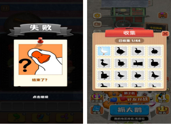 这是一款结合找茬与消除玩法的多人在线休闲游戏,核心玩法围绕“抓大鹅”展开,魔性十足。玩家需在限定时间内完成双关卡挑战,成功通关后可获得对应场景的专属大鹅角色。全国玩家同台竞技,根据所在省份的成就排名进行比拼,提升个人和地区榜单名次,增添社交竞争乐趣。