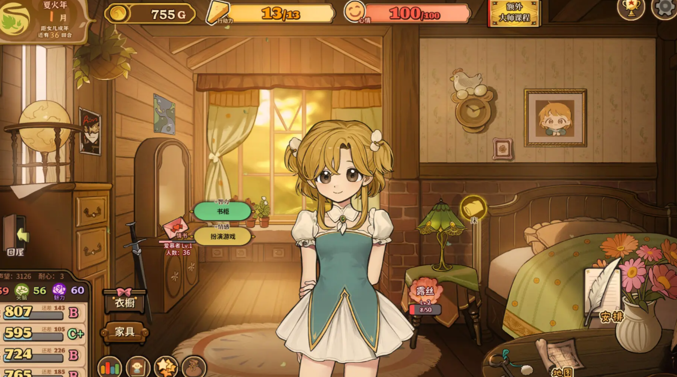 游戏有十几种不同类型的趣味游戏,各类游戏不仅能够增加女儿的体魄数值,还能够增加女儿的魅力以及品位。