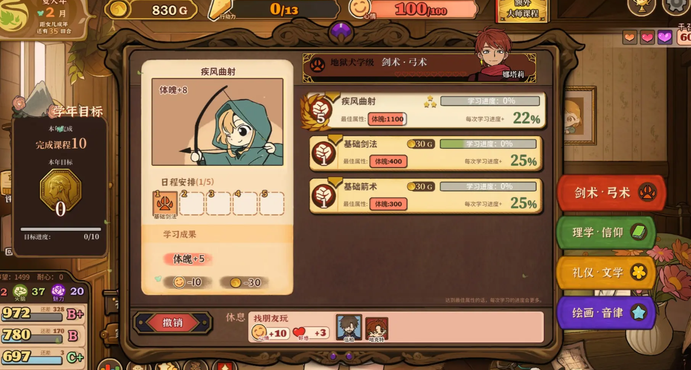 例如,玩家可以让女儿学习骑士的课业,也能够让女儿前往到占卜台之中,学习神秘学,当然,日常的娱乐项目例如耕种、烹饪、钓鱼、飞镖等等,都可以让玩家提高女儿的属性数值。