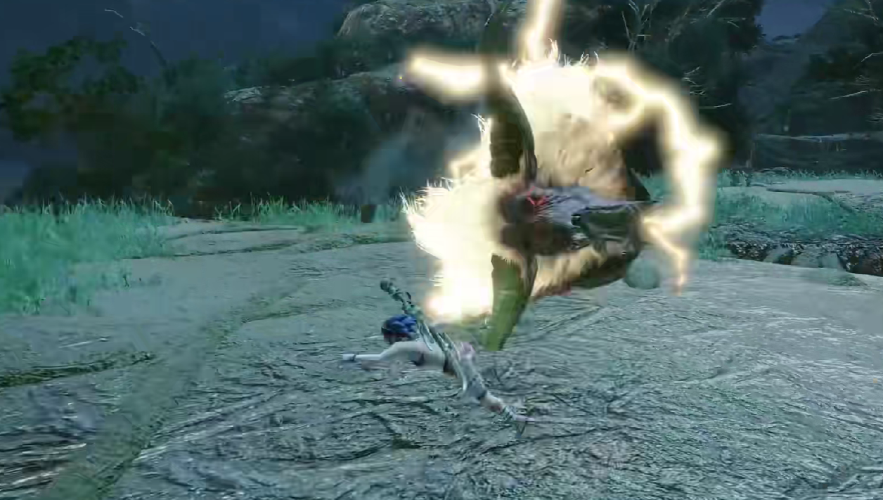 当然,玩家也可以使用双刀进行对决,在输出期间,玩家需要保持自己鬼人化的输出状态,在怪物疯狂摆动尾巴期间,会迅速下压,此时玩家即可攻击,对其使用乱舞攻击,直接命中头部。