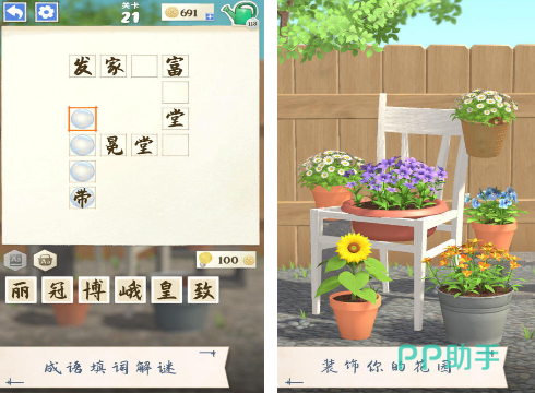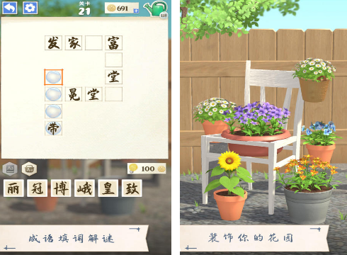 该游戏采用成语接龙的形式构建关卡体系,考验玩家的语言积累与反应能力。根据提示给出的字词,填入合适的汉字组成正确成语。成功通关可获得金币奖励,用于浇灌奶奶留下的花园,促使花朵逐一绽放。随着植物生长,画面逐渐变得五彩缤纷,营造出极具治愈感的视觉体验。