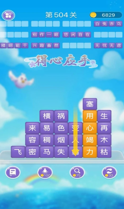玩法简单直观:在屏幕下方提供的文字中选择合适的字,填入上方的空格,组成正确的四字成语。每成功完成一关,即可获得相应奖励,逐步积累游戏内的资源。随着进度推进,题目难度逐渐上升,涉及更多类型的成语知识。操作便捷,规则清晰,适合利用碎片时间进行挑战,既能放松心情,又能扩展词汇量。